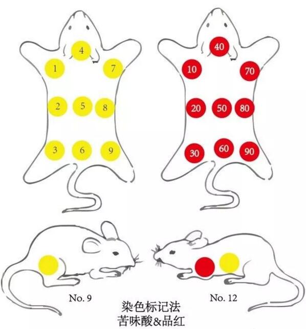 若動(dòng)物編號(hào)超過(guò)10 或更大數(shù)字時(shí),可使用上述兩種不同顏色的染色劑。雙色涂染法是采用兩種顏色同時(shí)進(jìn)行染色標(biāo)記的方法。如用苦昧酸( 黃色)染色標(biāo)記作為個(gè)位數(shù),用品紅( 紅色) 染色標(biāo)記作為十位數(shù)。個(gè)位數(shù)的染色標(biāo)記方法同單色涂染法;十位數(shù)的染色標(biāo)記方法參照單色涂染法,即左前肢為10 號(hào)、左側(cè)腹部20 號(hào)、左后肢30 號(hào)、頭部40 號(hào)、背部50 號(hào)、尾根部60 號(hào)、右前肢70 號(hào)、右側(cè)腹部80 號(hào)、右后肢90 號(hào),第100 號(hào)不做染色標(biāo)記。如標(biāo)記第12 號(hào)實(shí)驗(yàn)動(dòng)物,在其左前肢涂染品紅( 紅色),在其左側(cè)腹部涂上苦味酸( 黃色) 即可。雙色法色法可標(biāo)記100 位以?xún)?nèi)的號(hào)碼。