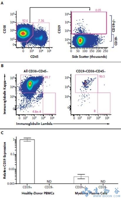 以患者接受自體移植前作為基線進行骨髓穿刺,通過流式細胞術(shù)來分析多發(fā)骨髓瘤中CD19的表達??梢源_定在漿細胞瘤中以CD38+ CD45-免疫表型和kappa 輕鏈限制性占主導地位(圖3)。多發(fā)性骨髓瘤漿細胞群體中CD19僅占0.05%(圖3A)。微量的CD19+亞群表達細胞內(nèi)kappa輕鏈(圖3B)和B細胞成熟抗原(BCMA),這是漿細胞特異性標志物(未示出),證實了其作為惡性漿細胞群體的一部分。此外,在CD19+一個小亞群CD45+細胞中檢可識別到一小集群Kappa限制性漿細胞(圖4,陰影內(nèi)圖片)。基線骨髓樣本中其他的CD19+集群包含多克隆CD19 + CD20+ B細胞和小部分CD45 + CD38(陰性)+ CD20-CD19 +輕鏈陰性細胞,很可能是pro-B細胞或幼稚pre-B細胞(圖4)。為了更靈敏地鑒定CD19的表達,我們使用FACS在CD19表達的2個閾值下對占主導的漿細胞集群進行分選(圖3A),并且我們通過RT-PCR測定法分析了分選的漿細胞CD19信使RNA(mRNA)的存在。通過流式細胞術(shù)檢測99.95%骨髓瘤漿細胞為CD19陰性的細胞沒有檢測到CD19mRNA(圖3C)。