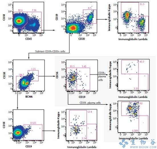從圖3可以看出,移植前骨髓穿刺取樣經(jīng)流式細胞術(shù)分析表明,多發(fā)性骨髓瘤漿細胞群體特征除CD19+外CD38+CD45?占主要部分。分析前,通過設門排除雙峰,碎片,T細胞,單核細胞和死細胞(未示出)。CD45+細胞(上排,左圖)中發(fā)現(xiàn)含有以下CD19+細胞群:多克隆CD19+ CD20+ B細胞(最上面一排,中間和右側(cè)圖);一小部分漿細胞群體(BCMA+ CD38 +),是CD19+一個亞群并都具有kapaa限制性(陰影內(nèi)圖片),這表明它們是多發(fā)性骨髓瘤克隆的一個組份;以及一小群CD45+ CD38(陰性)+ CD20-CD19+細胞無免疫球蛋白輕鏈的表達,最可能是pro-B細胞或幼稚pre-B細胞(第三行左側(cè)和中間圖)。BCMA表示B細胞成熟抗原。