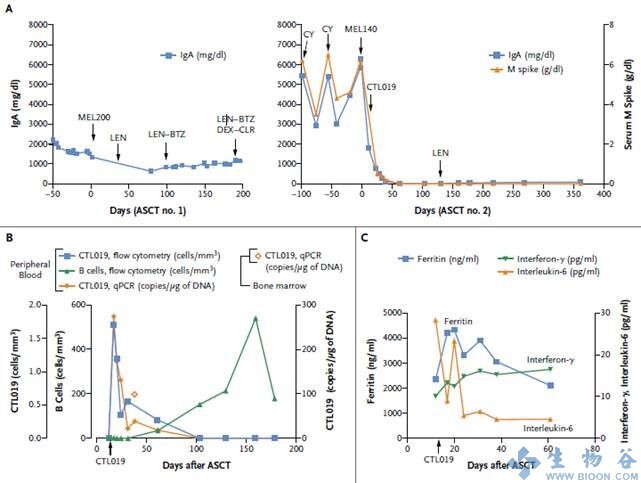 圖A表示在劑量為200mg/m2體表面積(MEL200)的馬法蘭處理下,初次ASCT后lgA濃度變化趨勢(左側(cè)),以及在劑量為140mg/m2體表面積(MEL200)的馬法蘭處理和CTL019輸注,在第二次ASCT后lgA濃度變化趨勢(右側(cè))。在首次ASCT后6個月,附加的治療包括來那度胺(LEN),硼替佐米(BTZ),地塞米松(DEX)和克拉霉素(CLR)。第二次ASCT之前連續(xù)輸注環(huán)磷酰胺兩個周期(CY)。同時也顯示了在第二次ASCT前和ASCT后期間血清單克隆蛋白濃度(M spike)。圖2表示在第二次ASCT后CTL019輸注,通過流式細胞術(shù)測定每立方毫米細胞數(shù)(僅外周血)和通過定量聚合酶鏈反應(qPCR)法測定每微克基因組DNA慢病毒載體序列的拷貝數(shù)(外周血和骨髓),以及通過每立方毫米細胞數(shù)測定相應的B細胞頻率。圖C表示血清鐵蛋白,IFN-γ和IL-6濃度。